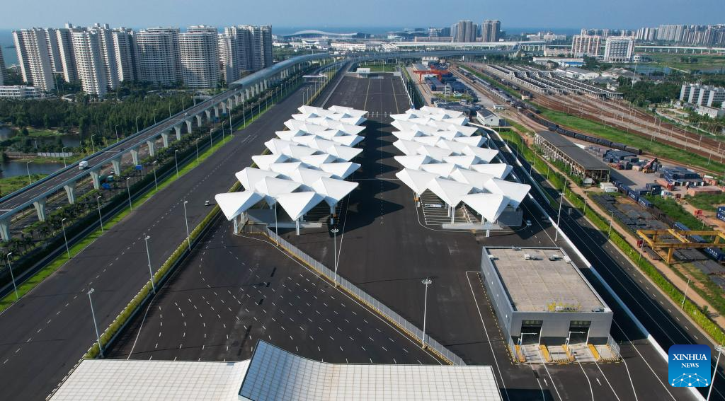A drone photo taken on Sept. 23, 2025 shows the customs inspection area at the centralized inspection yard of a freight port in Haikou, south China's Hainan Province. [Photo/Xinhua]