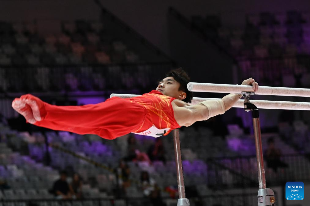 Zou Jingyuan of China competes during the men's Parallel Bars Final at 53rd FIG Artistic Gymnastics World Championships in Jakarta, Indonesia, on Oct. 25, 2025. [Photo/Xinhua]