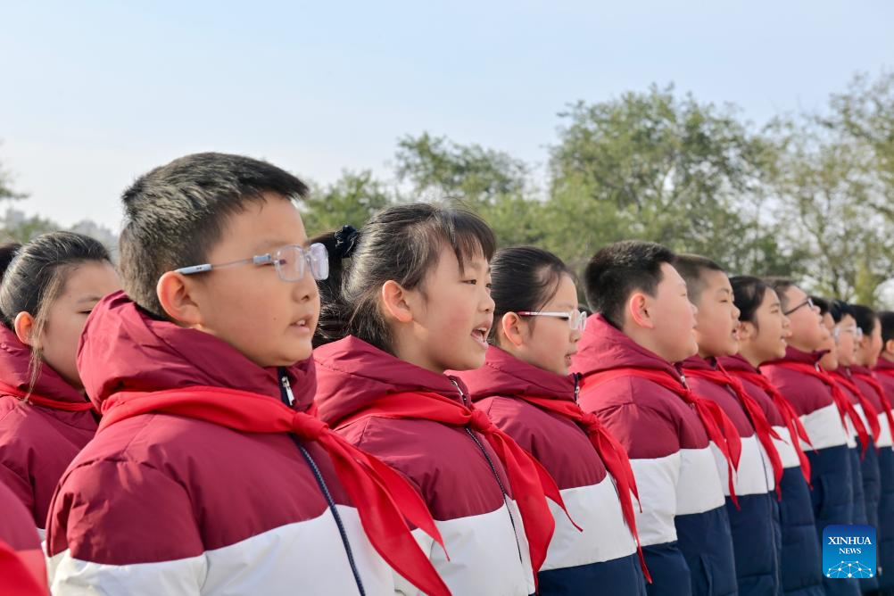 Students sing the national anthem during a flower baskets presenting ceremony at the memorial tower in the Memorial Hall of the War to Resist U.S. Aggression and Aid Korea in Dandong, northeast China's Liaoning Province, Oct. 25, 2025. Liaoning Province on Saturday held flower baskets presenting ceremonies in Shenyang and Dandong to commemorate the 75th anniversary of the Chinese People's Volunteers' (CPV) entering the Democratic People's Republic of Korea to fight in the War to Resist U.S. Aggression and Aid Korea. (Xinhua/Wu Qinghao)