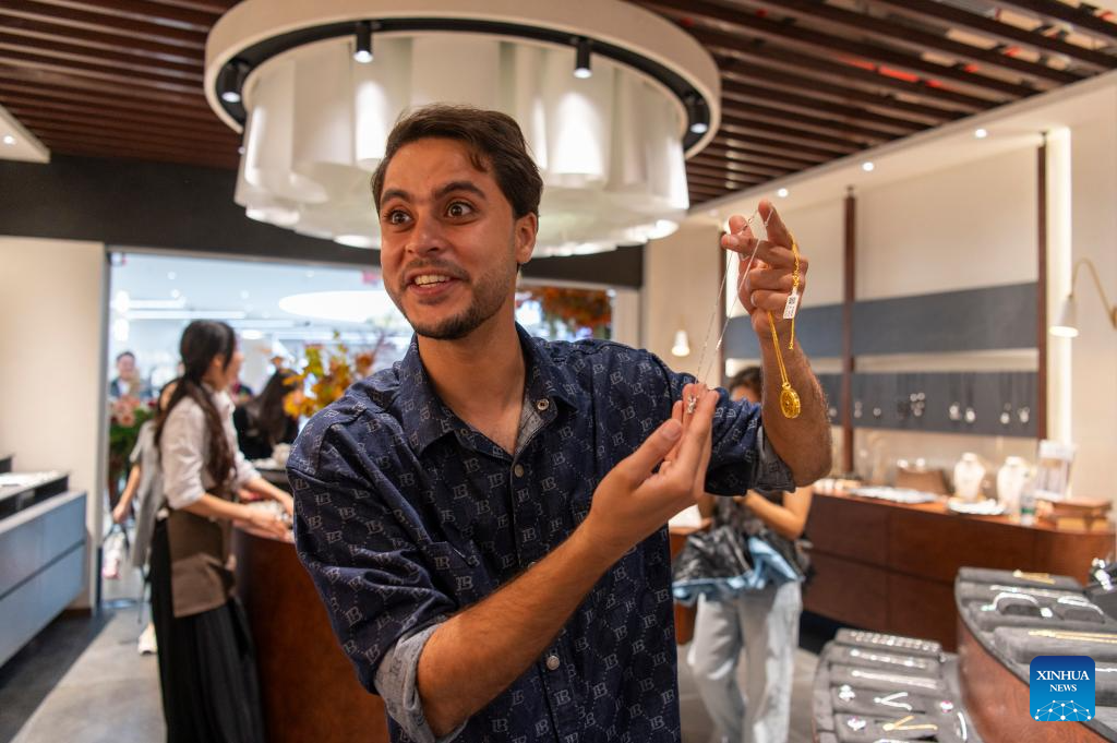 A foreign merchant purchases jewelry and accessories at the Global Digital Trade Center in Yiwu, east China's Zhejiang Province, Oct. 14, 2025. [Photo/Xinhua]