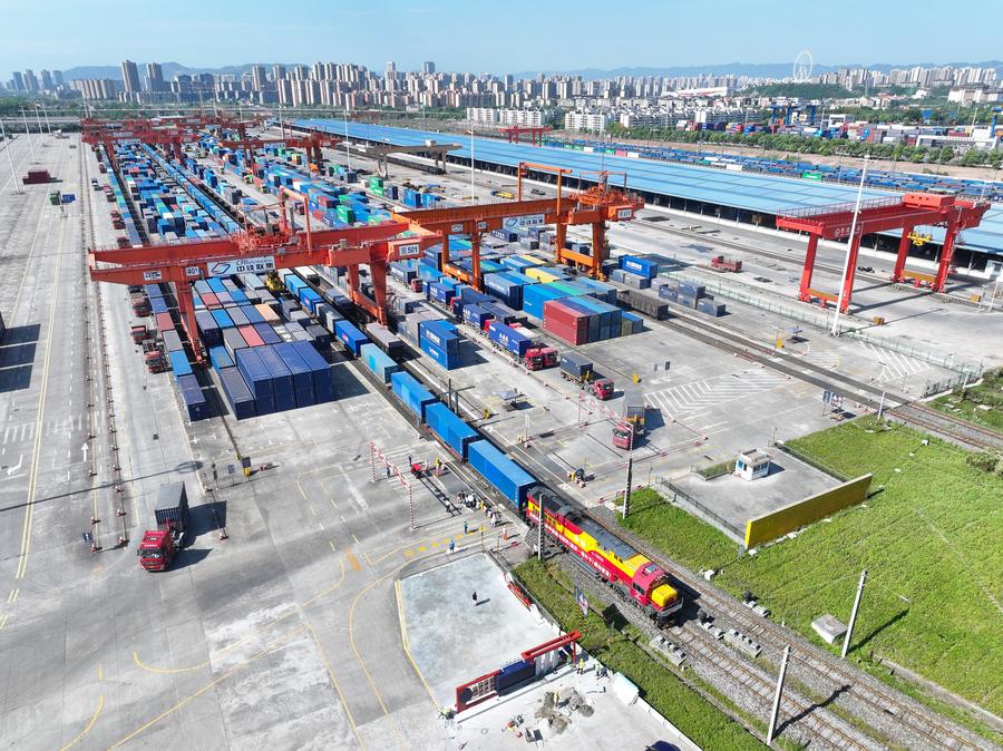 An aerial drone photo taken on April 20, 2025 shows a China-Central Asia freight train departing from the Tuanjiecun Station in southwest China's Chongqing. [Photo/Xinhua]