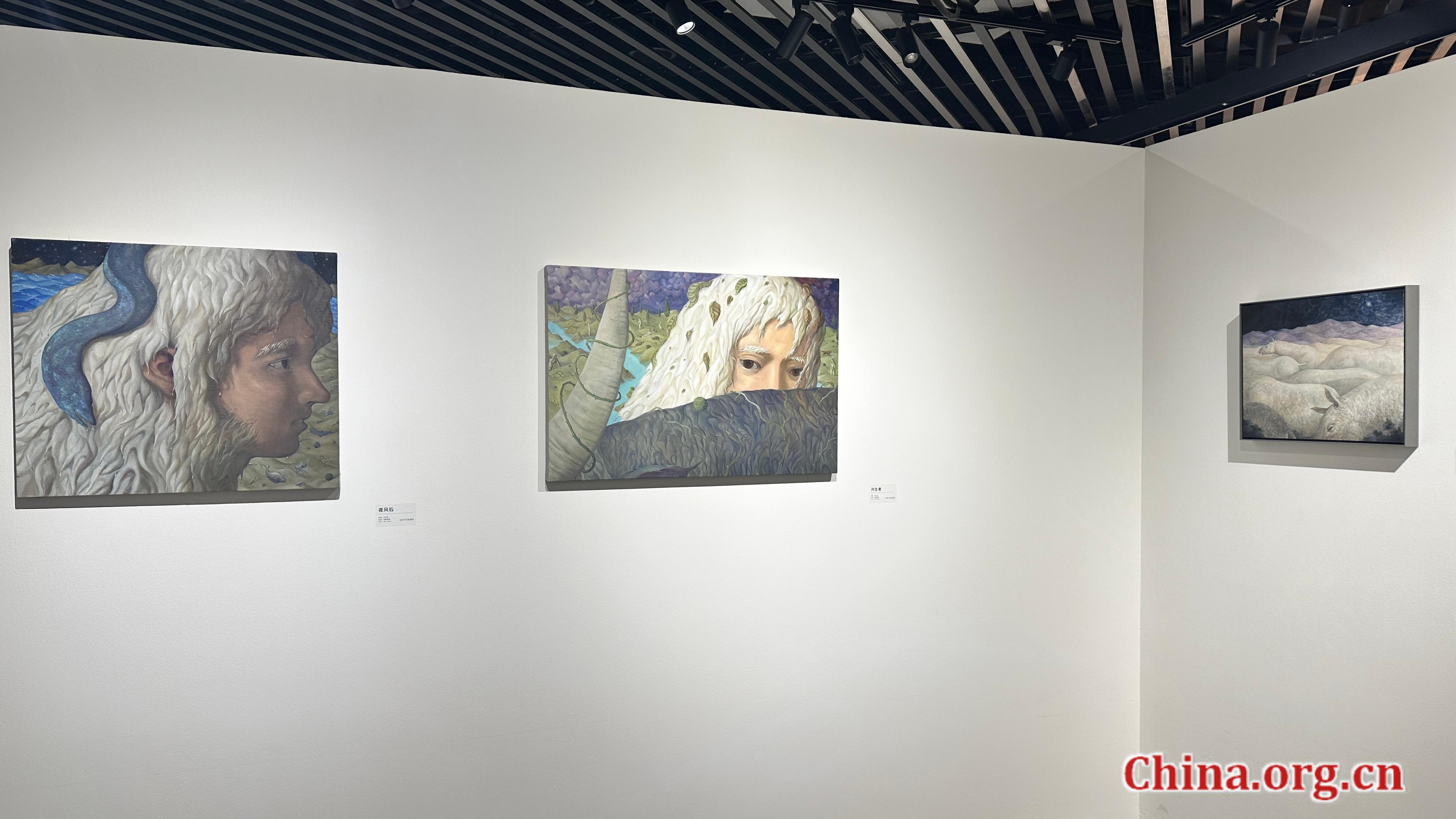 Paintings by Liu Fangxiang on display at Rendez-Vous Gallery, Beijing, Oct. 27, 2025. Liu's practice focuses on the subtle relationship between natural phenomena and human creation. By reimagining reality through a detached, speculative lens, Liu builds a poetic world where human presence and natural processes intertwine. [Photo by Liu Ziying/China.org.cn]