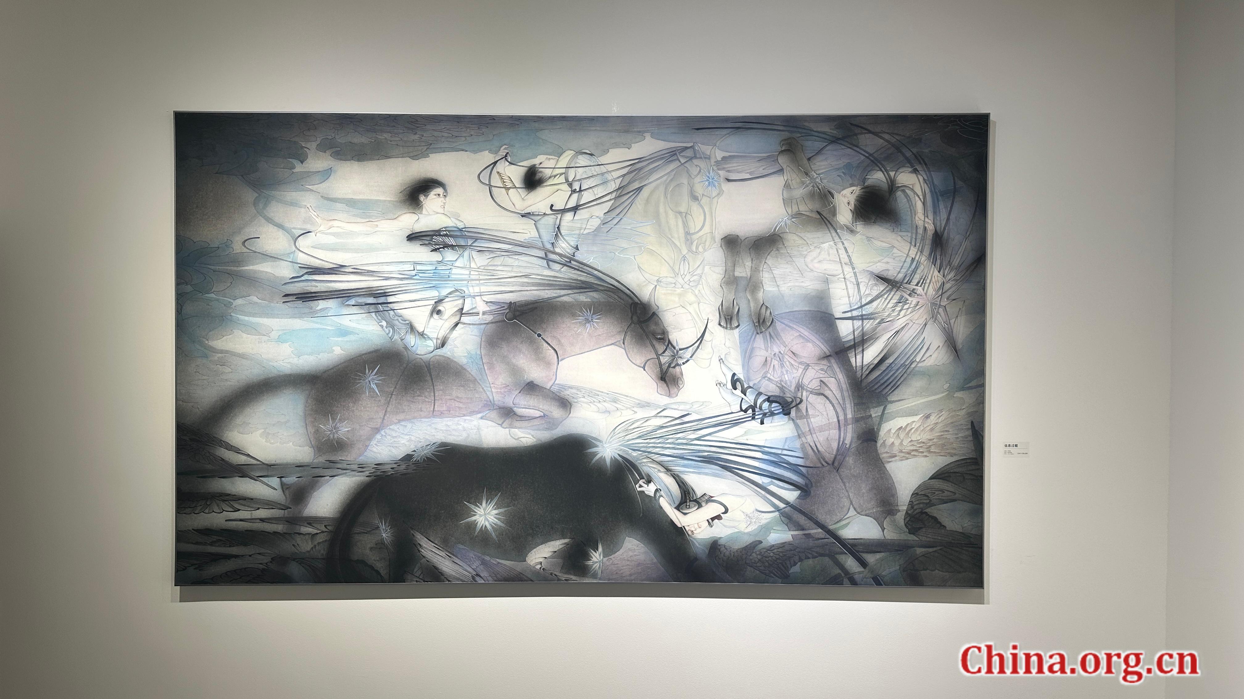 "Information Overload" by Shen Ganjun, a work investigating the contemporary transformation of Chinese painting, on display at Rendez-Vous Gallery, Beijing, Oct. 27, 2025. Through a narrative conceptual approach, Shen reconstructs historical and religious imagery, reflecting on the philosophical and spiritual dimensions of tradition within modernity. [Photo by Liu Ziying/China.org.cn]