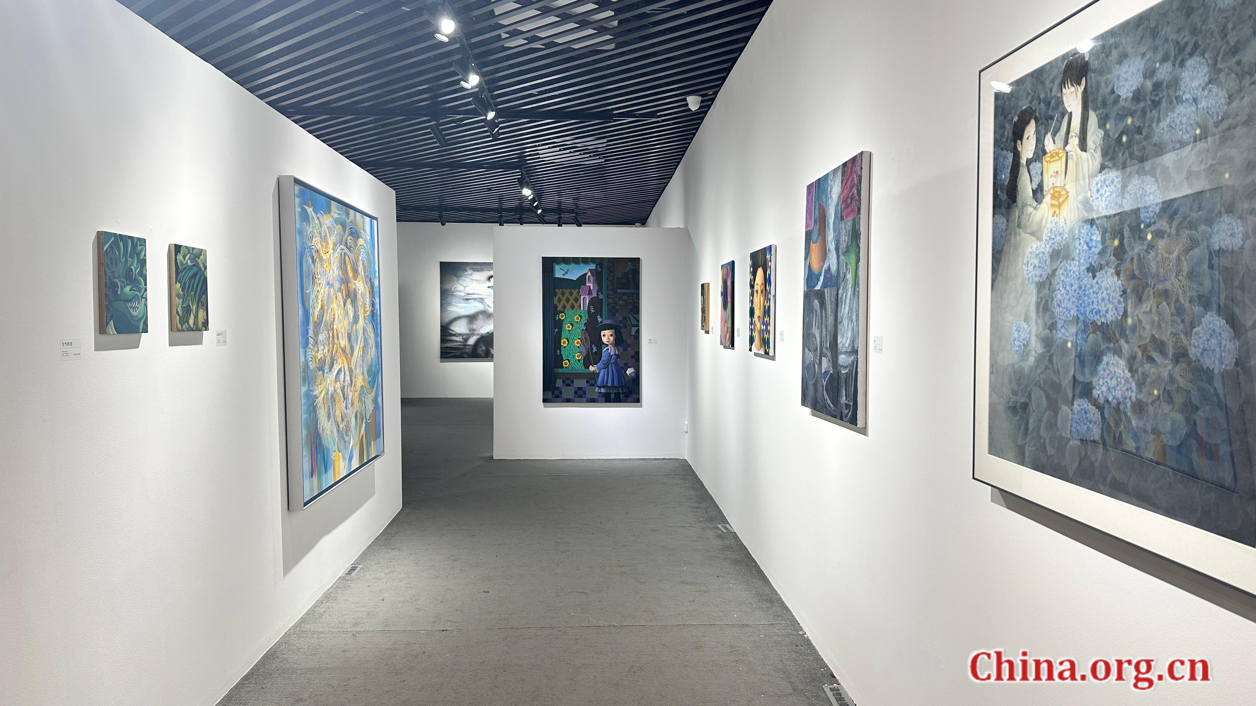 Works by Xing Xing and Xu Shenhong, whose practices extend the exhibition's thematic spectrum, on display at Rendez-Vous Gallery, Beijing, Oct. 27, 2025. Their distinct forms further reveal how young Chinese artists negotiate individuality within collective expression, allowing the "burning" motif to unfold as both inner impulse and shared reflection. [Photo by Liu Ziying/China.org.cn]