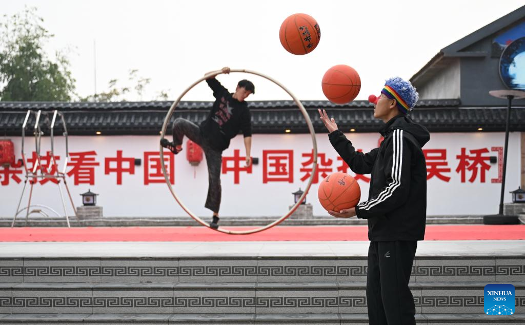 Students practice acrobatic skills at an acrobatic courtyard, which is located along an embankment road of the Grand Canal, in Wuqiao County of Cangzhou, north China's Hebei province, Oct. 28, 2025.