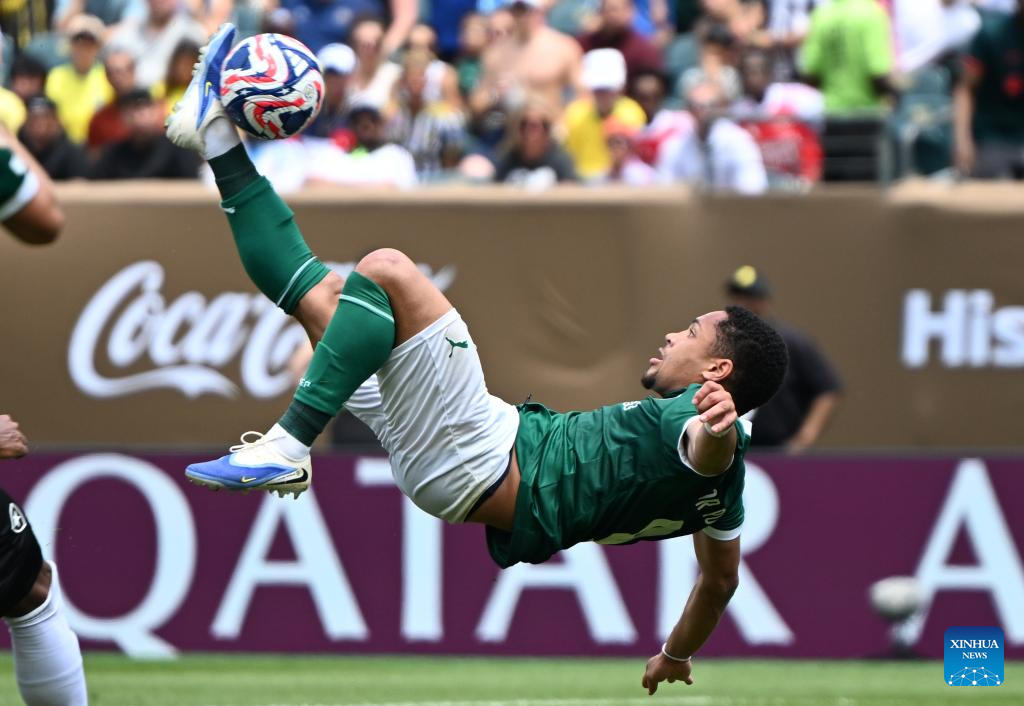 Palmeiras' Vitor Roque takes a bicycle kick during the round of 16 football match between Brazil's Palmeiras and Brazil's Botafogo at the FIFA Club World Cup 2025 in Philadelphia, the United States, June 28, 2025. (Xinhua/Li Rui)
