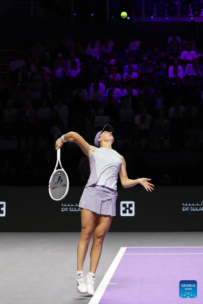 Iga Swiatek of Poland serves during the round robin match against Elena Rybakina of Kazakhstan at WTA Finals tennis tournament in Riyadh, Saudi Arabia, on Nov. 3, 2025. (Xinhua/Luo Chen)