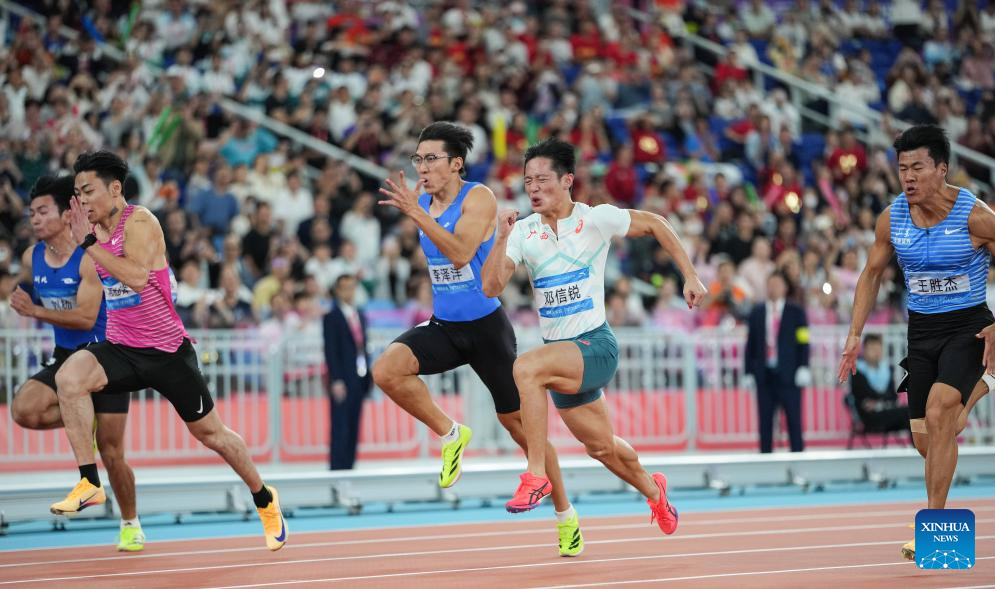 Li Zeyang (C) of Hubei competes during the men's 100m final of athletics at China's 15th National Games in Guangzhou, south China's Guangdong Province, Nov. 17, 2025. (Xinhua/Li Yibo)