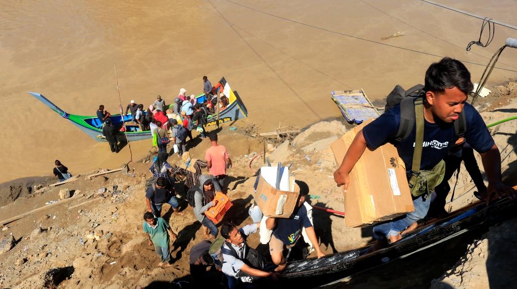 This photo taken on Nov. 30, 2025 shows people crossing a river by boat after a bridge was damaged by floodwaters in Bireuen Regency, Aceh Province, Indonesia. [Photo/Xinhua]