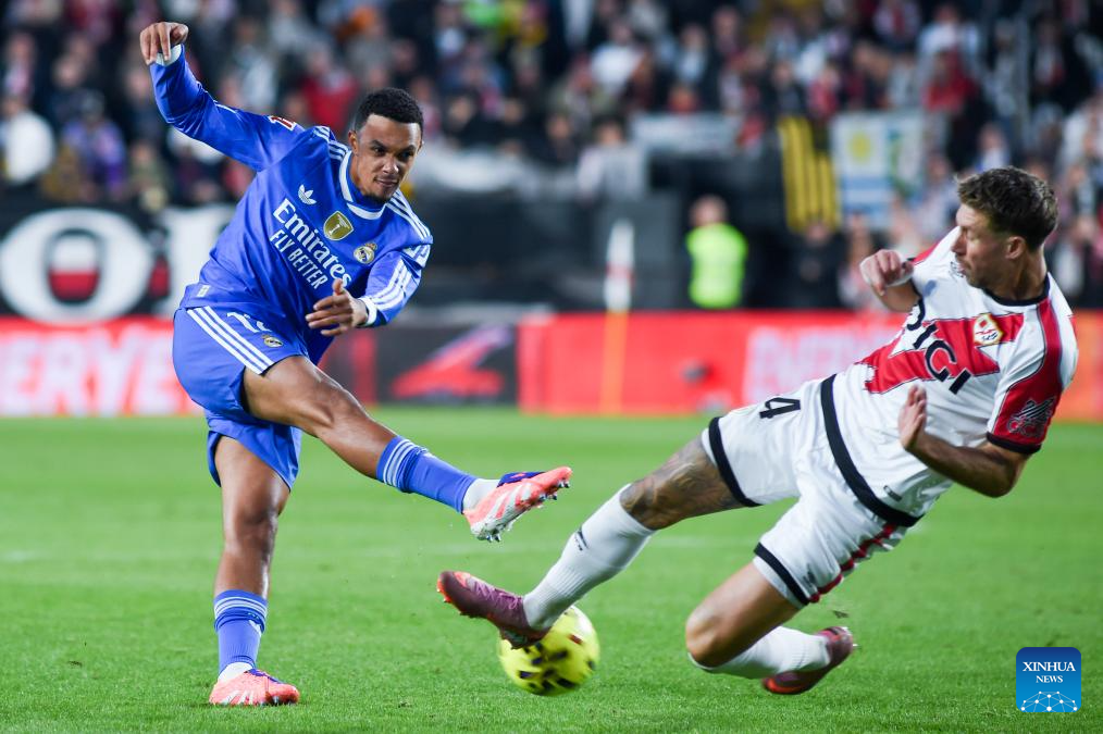 Trent Alexander-Arnold (L) of Real Madrid vies with Florian Lejeune of Rayo Vallecano during the La Liga football match between Real Madrid and Rayo Vallecano in Madrid, Spain, on Nov. 9, 2025. (Photo by Gustavo Valiente/Xinhua)