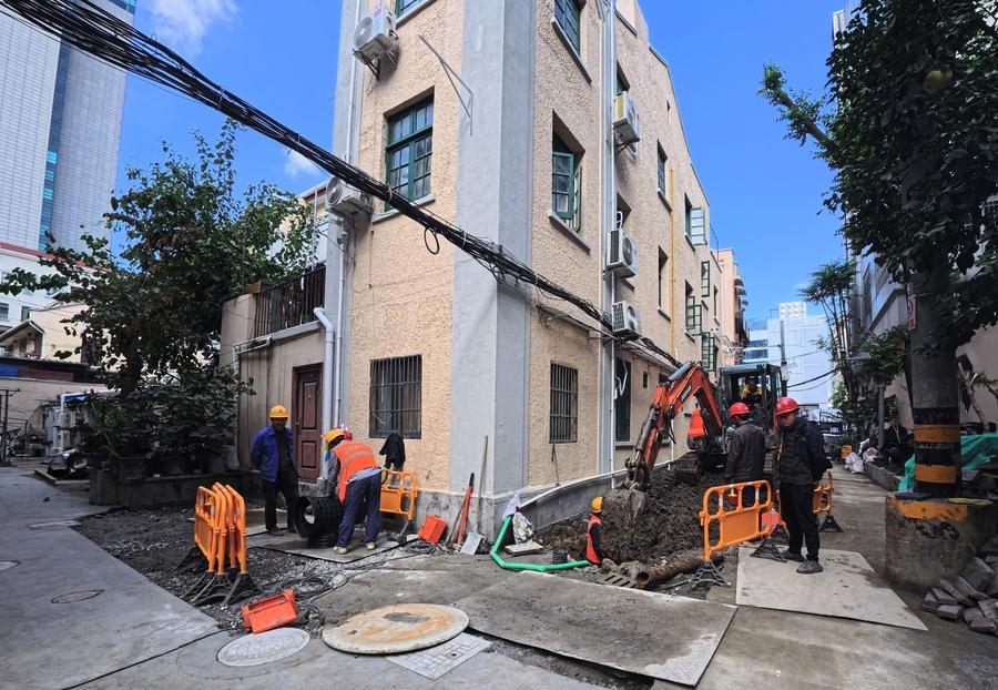 This photo taken on Oct. 31, 2025 shows the construction site of a sewage pipeline renovation project in an old neighborhood in east China's Shanghai. [Photo/Xinhua]