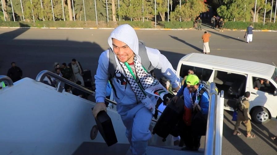 This video screenshot shows sailors of cargo vessel Eternity C boarding a plane at the Sanaa International Airport, in Sanaa, Yemen, on Dec. 3, 2025. [Photo/Houthi Media Center handout via Xinhua]