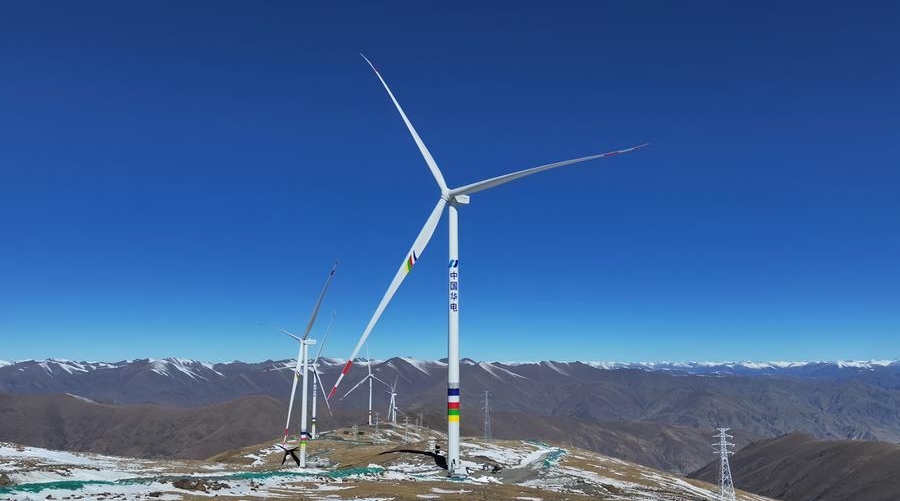 This photo taken on Nov. 15, 2025 shows a view of a wind farm built by the Xizang branch of Huadian New Energy Group Co., Ltd. in Qonggyai County, southwest China's Xizang Autonomous Region. [Photo/Xinhua]