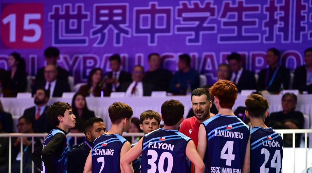 Players of Chile are instructed by their coach during the match against China's men's team 1 at the ISF U15 World School Volleyball Championship 2025 in Shangluo, northwest China's Shaanxi Province, Dec. 5, 2025. (Xinhua/Zou Jingyi)