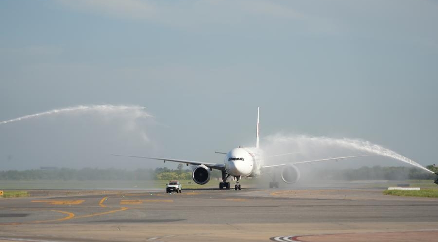 China Eastern Airlines' flight MU745, the first direct air route between China and Argentina, passes through a water gate at Ezeiza International Airport in Buenos Aires, Argentina, Dec. 4, 2025. [Photo/Xinhua]
