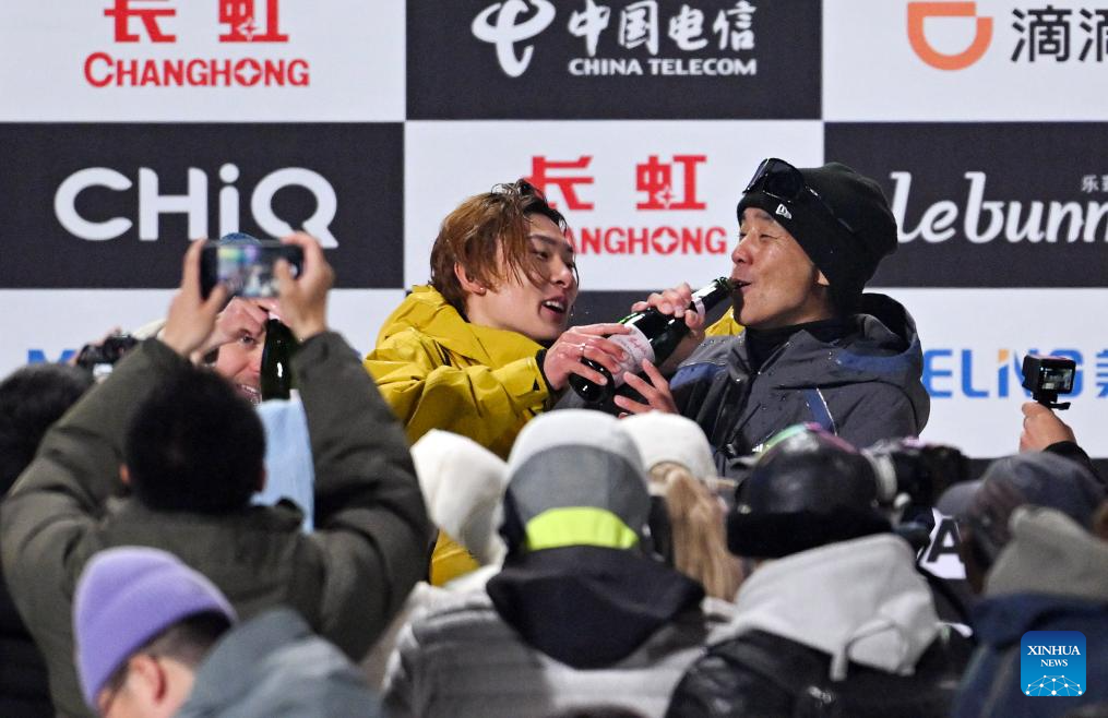 Su Yiming (L) of China celebrates with his coach after the awarding ceremony for the men's big air at the FIS Snowboard World Cup in Beijing, China, Dec. 6, 2025. (Xinhua/Tao Xiyi)