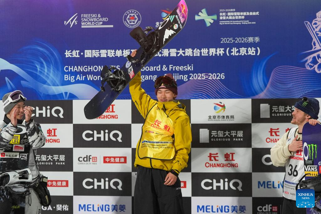 Su Yiming (C) of China reacts during the awarding ceremony after the men's big air final at the FIS Snowboard World Cup in Beijing, China, Dec. 6, 2025. (Xinhua/Ju Huanzong)