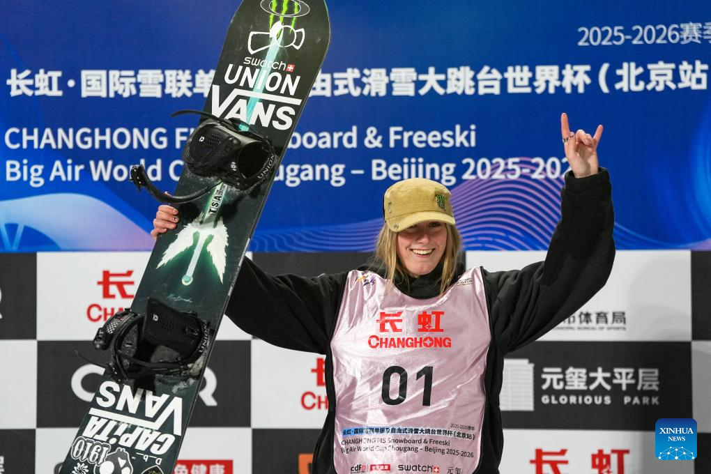 Gold medalist Mia Brookes of Britain reacts during the awarding ceremony after the women's big air final at the FIS Snowboard World Cup in Beijing, China, Dec. 6, 2025. (Xinhua/Ju Huanzong)