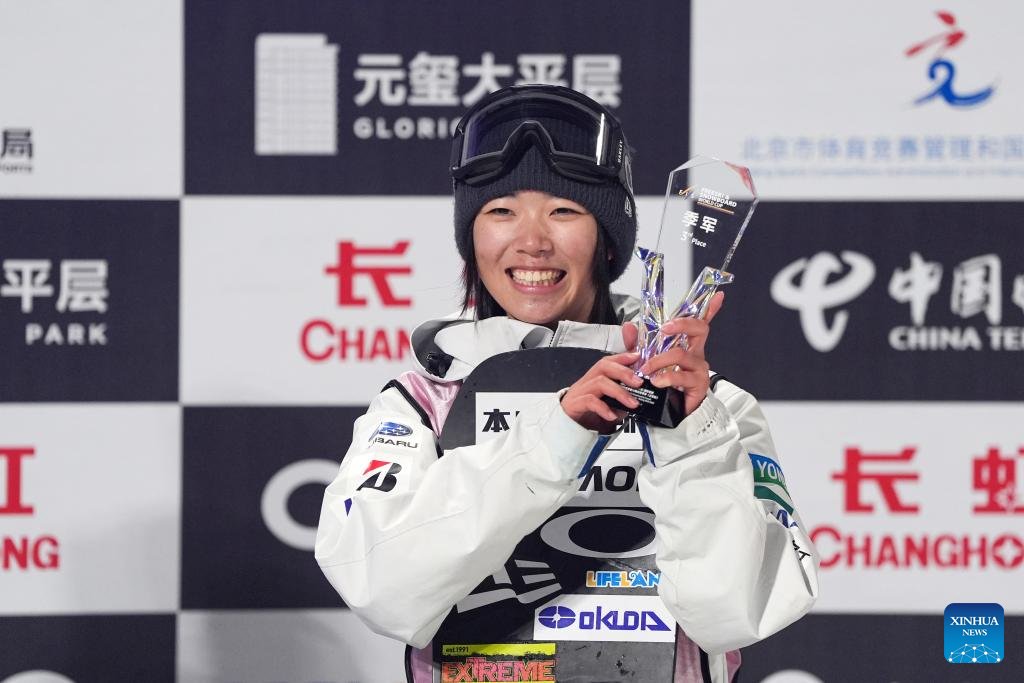 Bronze medalist Suzuki Momo of Japan reacts during the awarding ceremony after the women's big air final at the FIS Snowboard World Cup in Beijing, China, Dec. 6, 2025. (Xinhua/Ju Huanzong)