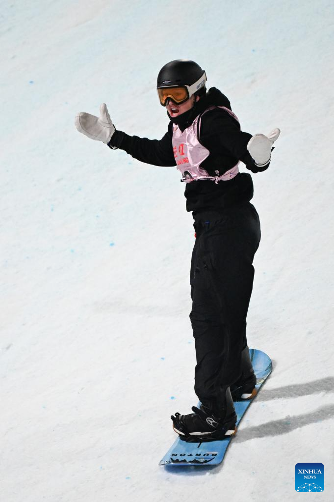 Hanna Karrer of Austria reacts during the women's big air final at the FIS Snowboard World Cup in Beijing, China, Dec. 6, 2025. (Xinhua/Ju Huanzong)