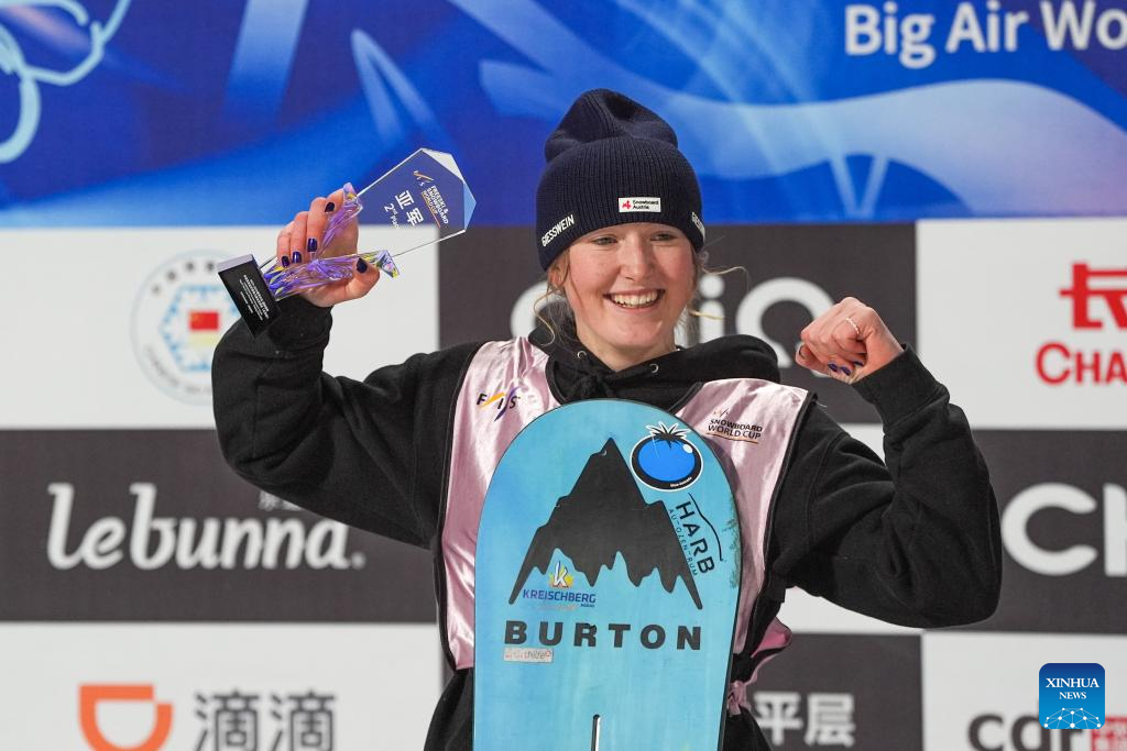 Silver medalist Hanna Karrer of Austria reacts during the awarding ceremony after the women's big air final at the FIS Snowboard World Cup in Beijing, China, Dec. 6, 2025. (Xinhua/Ju Huanzong)