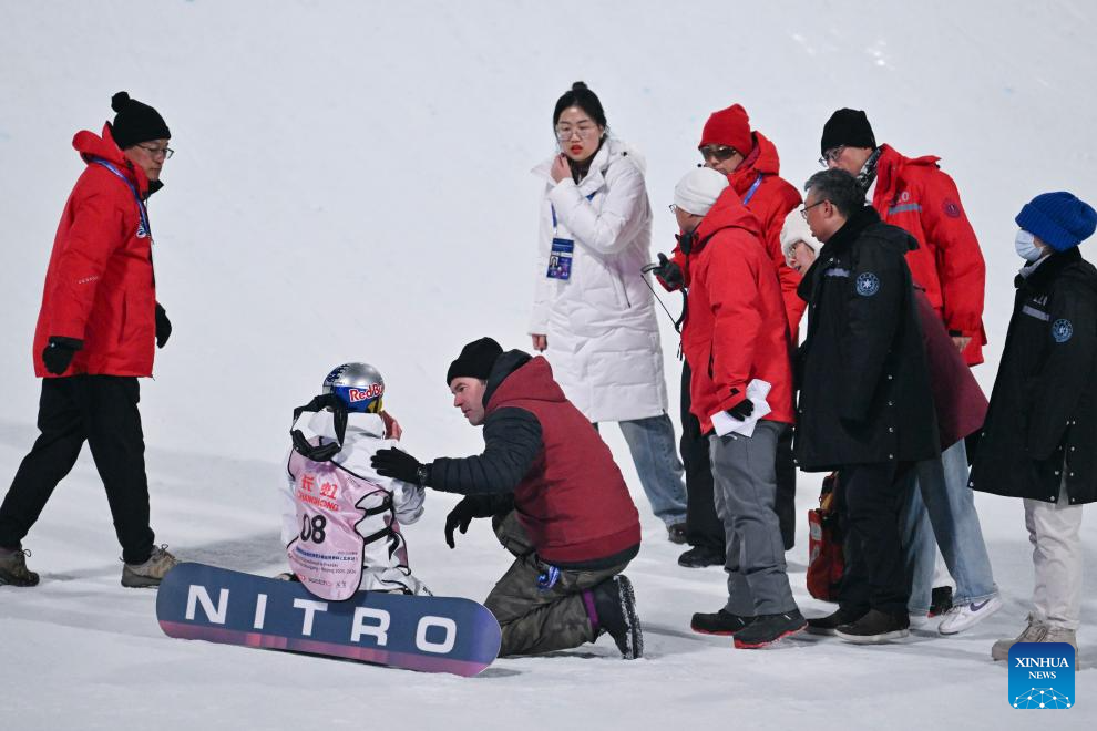 Onitsuka Miyabi (2nd L) of Japan is injured during the women's big air final at the FIS Snowboard World Cup in Beijing, China, Dec. 6, 2025. (Xinhua/Tao Xiyi)