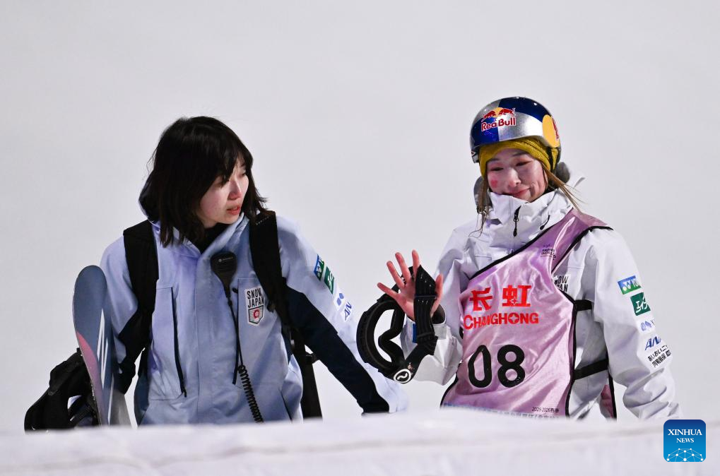 Onitsuka Miyabi (R) of Japan reacts after suffering an injury during the women's big air final at the FIS Snowboard World Cup in Beijing, China, Dec. 6, 2025. (Xinhua/Tao Xiyi)