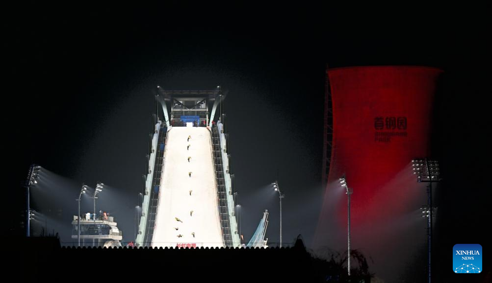 This multiple exposure photo shows Su Yiming of China competing during the men's big air final at the FIS Snowboard World Cup in Beijing, China, Dec. 6, 2025. (Xinhua/Tao Xiyi)
