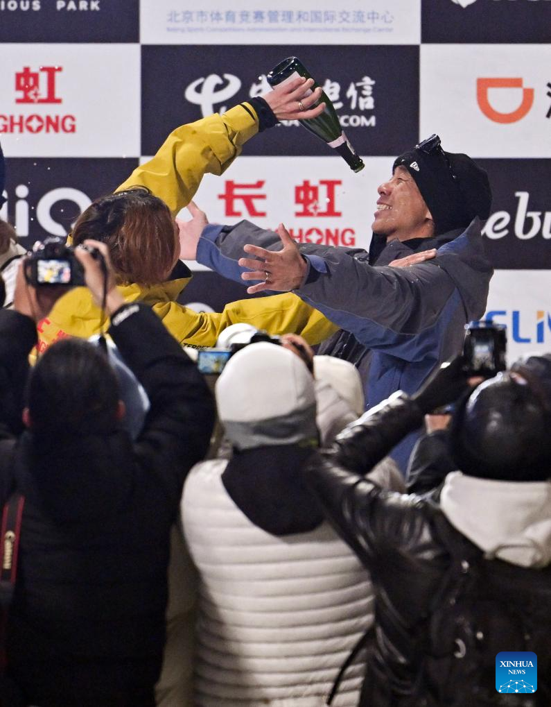 Su Yiming (L) of China celebrates with his coach after the awarding ceremony for the men's big air at the FIS Snowboard World Cup in Beijing, China, Dec. 6, 2025. (Xinhua/Tao Xiyi)