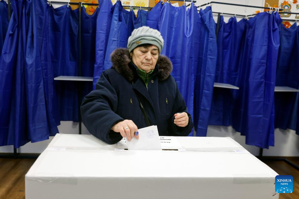 A woman votes during a local election at a polling station in Bucharest, Romania, on Dec. 7, 2025. [Photo/Xinhua]