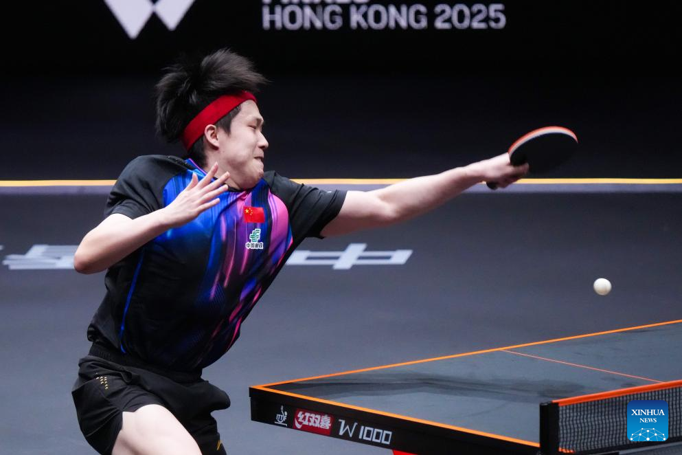 Wang Chuqin hits a return during the men's singles round of 16 match between Wang Chuqin of China and Matsushima Sora of Japan at the WTT Finals Hong Kong 2025 in Hong Kong, south China, Dec. 10, 2025. (Xinhua/Zhu Wei)