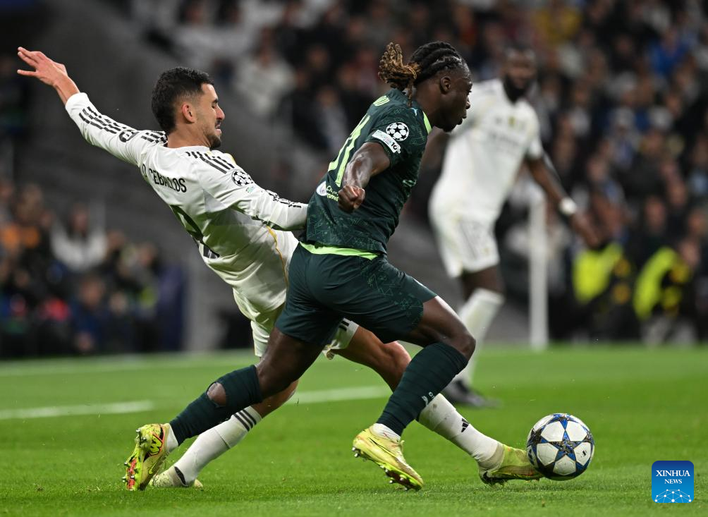 Dani Ceballos (L) of Real Madrid vies for the ball during the UEFA Champions League football match between Real Madrid and Manchester City in Madrid, Spain, Dec. 10, 2025. (Xinhua/Cheng Min)