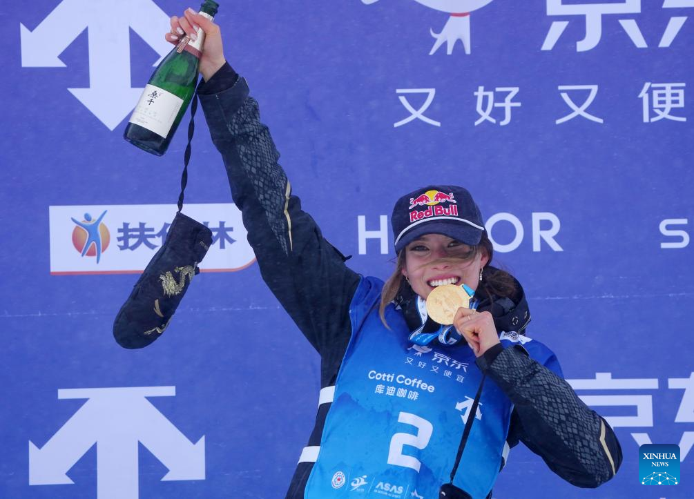 Gold medalist Gu Ailing of China reacts during the awarding ceremony for the women's freeski halfpipe of FIS Freeski World Cup 2025 in Zhangjiakou, north China's Hebei Province, Dec. 13, 2025. (Xinhua/Wang Peng)