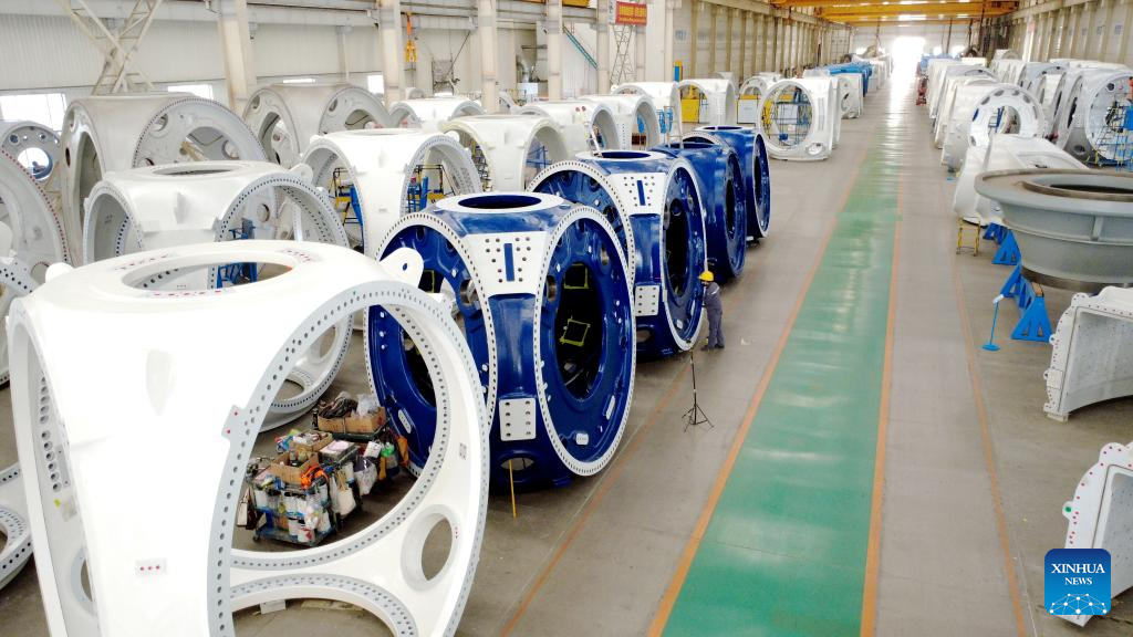 A drone photo taken on Dec. 15, 2025 shows a worker cleaning wind turbine hubs at a wind power equipment industrial park in Binzhou, east China's Shandong Province. (Photo by Wang Jun/Xinhua)