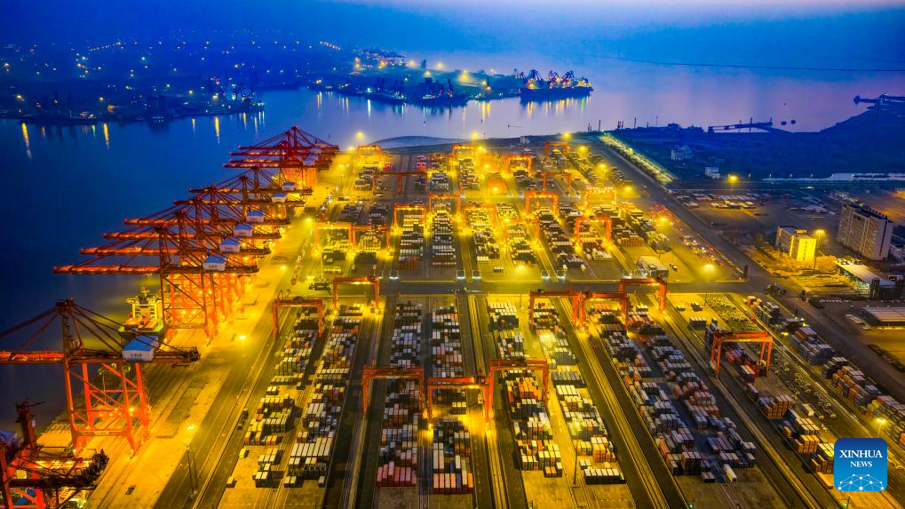 An aerial drone photo taken on Dec. 15, 2025 shows a container dock at Tangshan Port in Tangshan, north China's Hebei Province. (Photo by Liu Mancang/Xinhua)