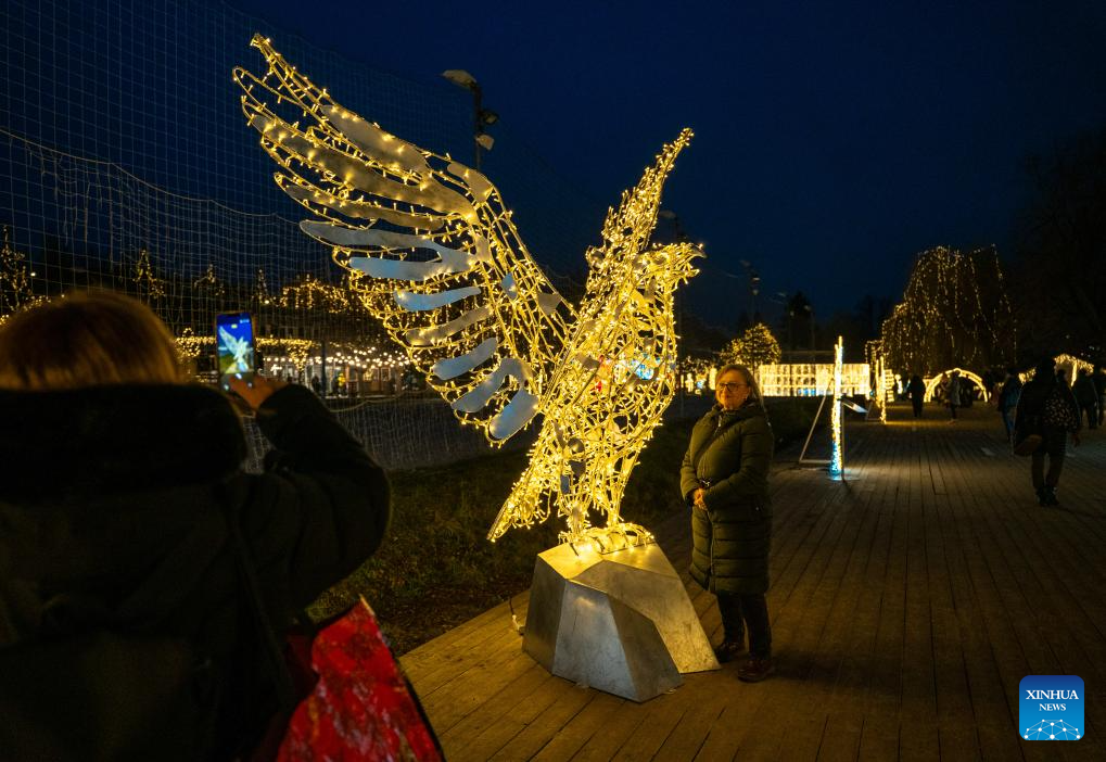 A woman poses for photos at the Story of Lights themed park in Prague, the Czech Republic, Dec. 19, 2025. An Europe-themed light park illuminates the banks of the Vltava River in Prague, offering visitors an immersive journey of architecture and light. [Photo by Dana Kesnerova/Xinhua]