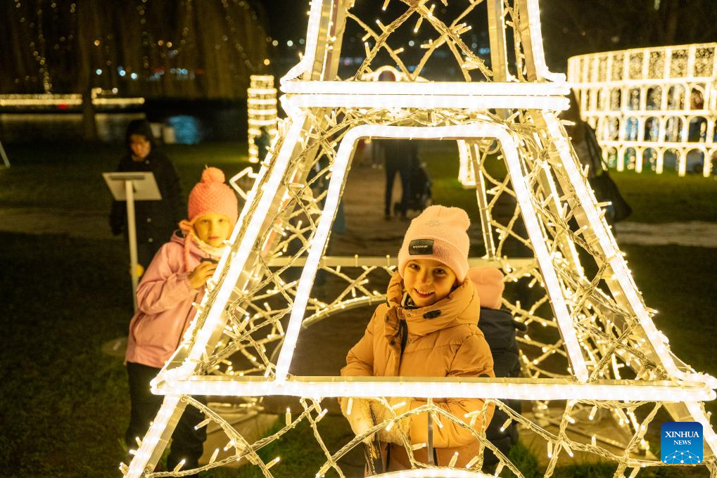 Children play at the Story of Lights themed park in Prague, the Czech Republic, Dec. 19, 2025. An Europe-themed light park illuminates the banks of the Vltava River in Prague, offering visitors an immersive journey of architecture and light. [Photo by Dana Kesnerova/Xinhua]