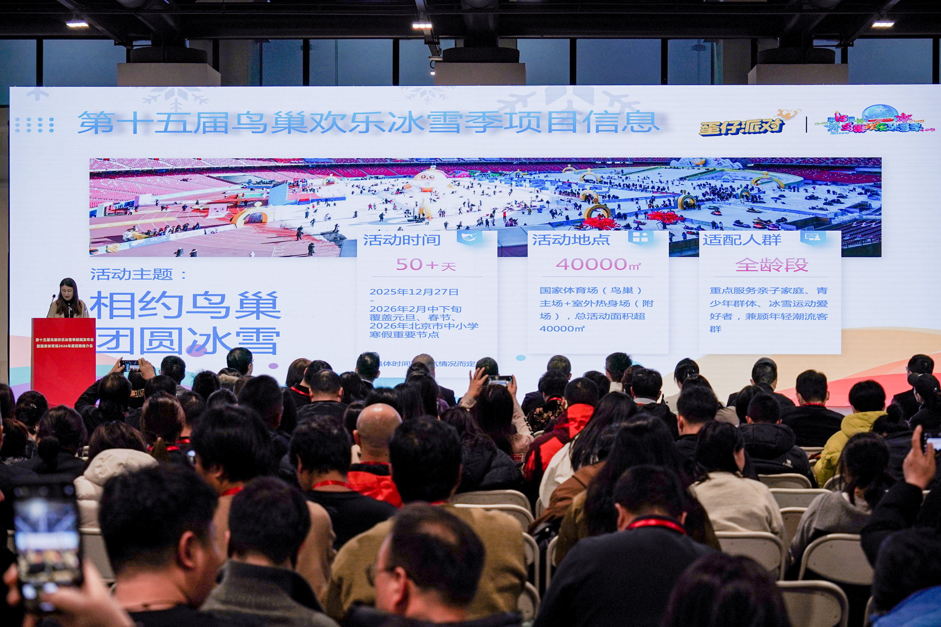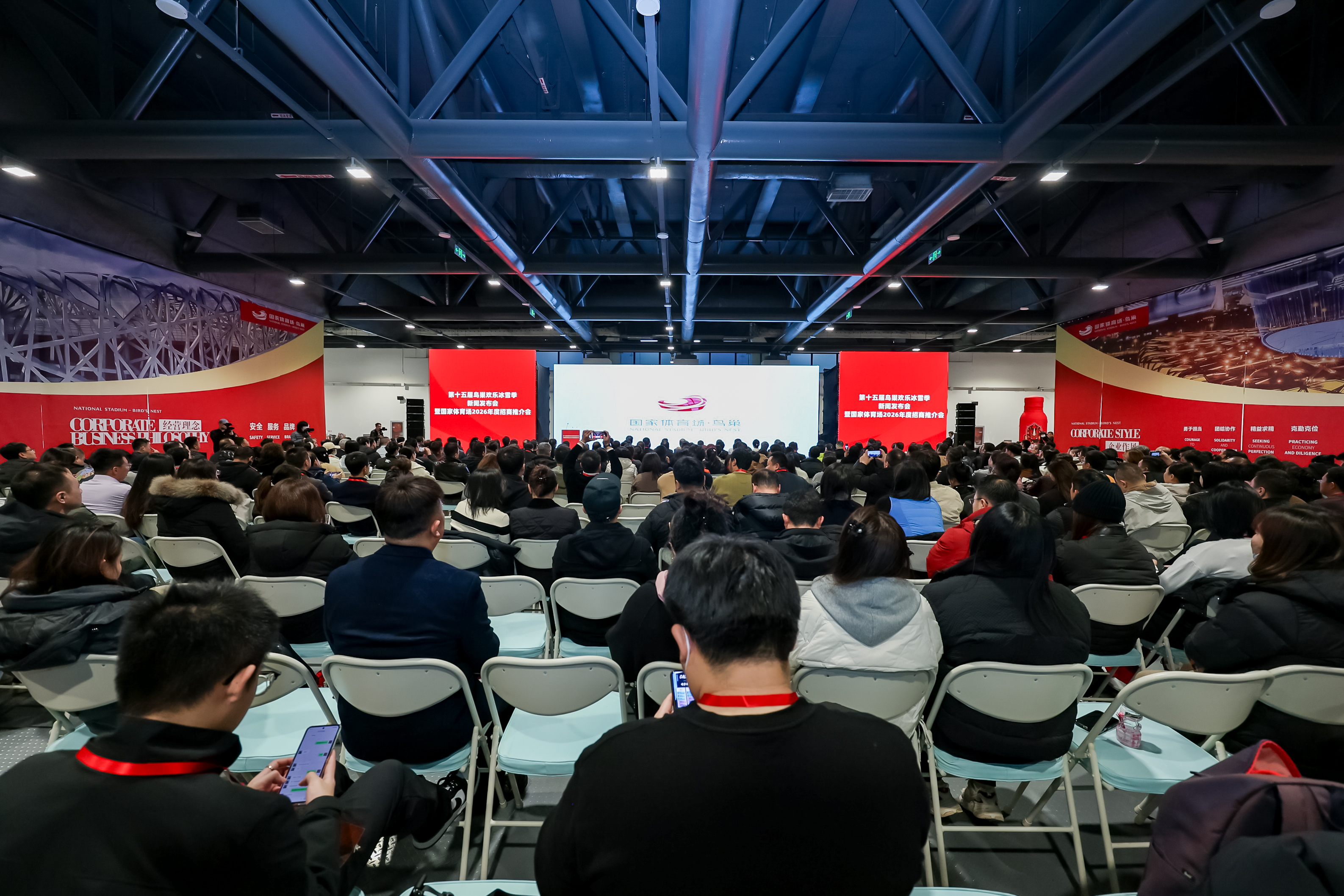 Attendees listen to a presentation on the stadium's investment and collaboration initiatives for 2026 during a press conference at the National Stadium in Beijing, Dec. 18, 2025. [Photo provided to China.org.cn]