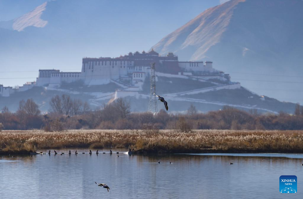 Bar-headed geese are pictured at the Lhalu Wetland National Nature Reserve, with the Potala Palace in the background, in Lhasa, southwest China's Xizang Autonomous Region, Dec. 20, 2025. [Photo/Xinhua]