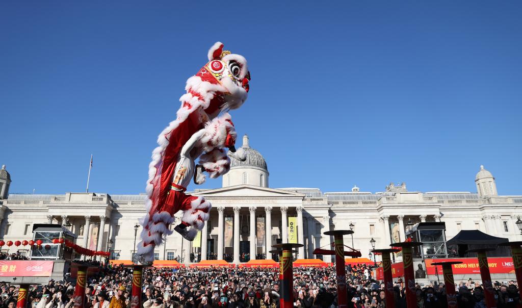 Lion dancers perform at Trafalgar Square to celebrate the Chinese New Year in London, Britain, on Feb. 2, 2025. Various activities were held in London to celebrate the Chinese Year of the Snake on Feb. 2, 2025. (Xinhua/Li Ying)