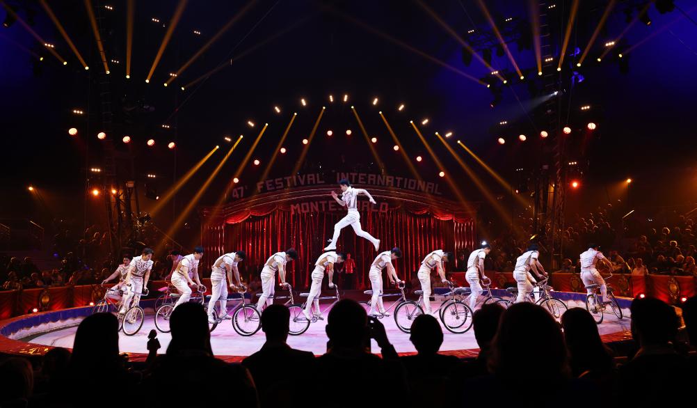 Performers from the National Acrobatic Troupe of China perform "Acrobats on Bicycles" at the 47th International Circus Festival of Monte-Carlo, Monaco, Jan. 17, 2025. (Xinhua/Gao Jing)