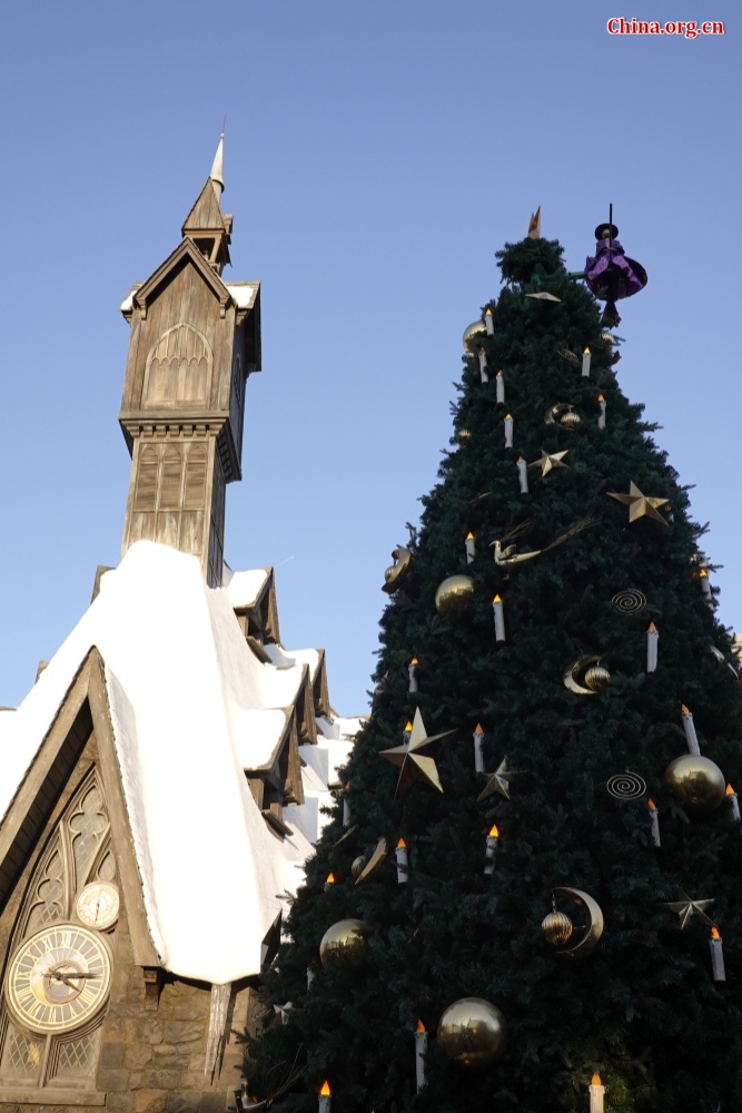 A decorated evergreen tree stands at the edge of Hogsmeade village, the Harry Potter-themed area at Universal Beijing Resort, Dec. 24, 2025. [Photo by Yan Xiaoqing/China.org.cn]