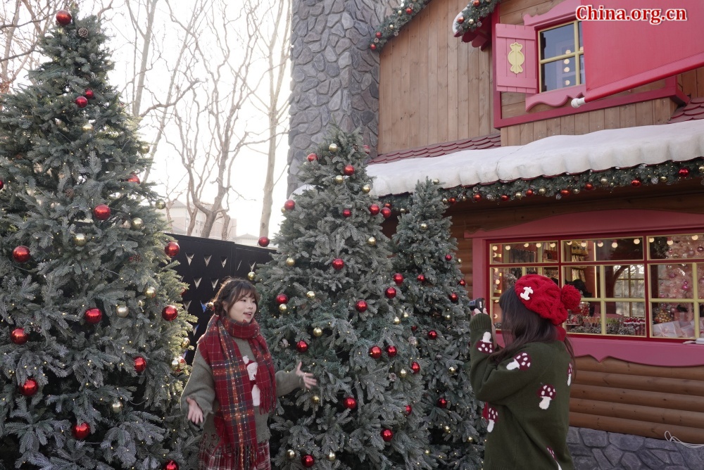 Visitors pose in front of holiday decorations at Universal Beijing Resort, Dec. 24, 2025. [Photo by Yan Xiaoqing/China.org.cn]