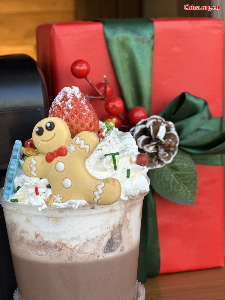 Holiday hot chocolate is served at Universal Beijing Resort, Dec. 24, 2025. [Photo by Yan Xiaoqing/China.org.cn]