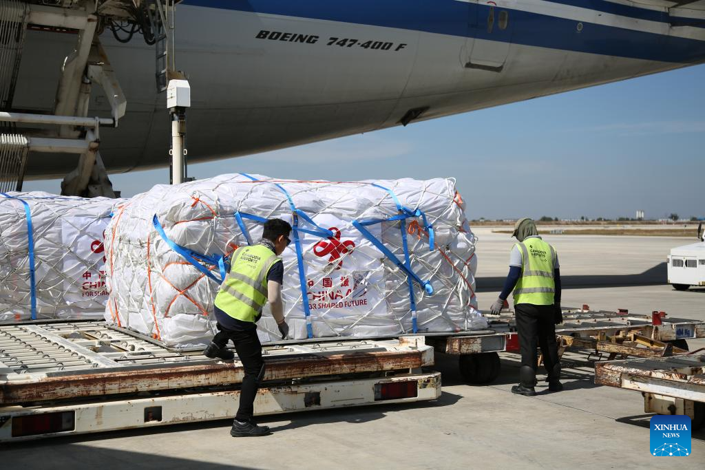The first batch of emergency humanitarian aid supplies provided by the Chinese government to Cambodia arrives at the Techo International Airport in Phnom Penh, Cambodia, Dec. 28, 2025. [Photo/Xinhua]