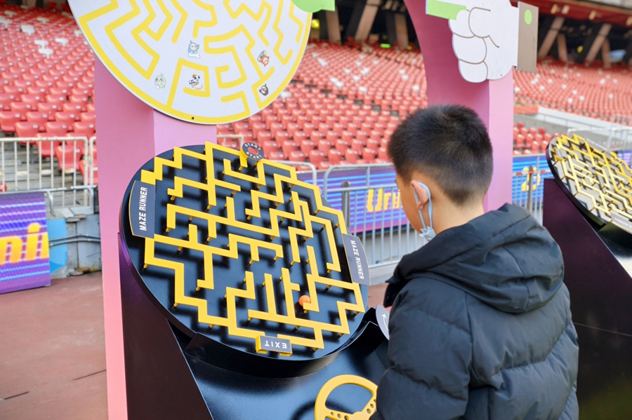 A boy tries out an interactive game installation in the National Stadium during the 15th Bird's Nest Happy Ice and Snow Season in Beijing, Dec. 27, 2025. [Photo by Gong Yingchun/China.org.cn]