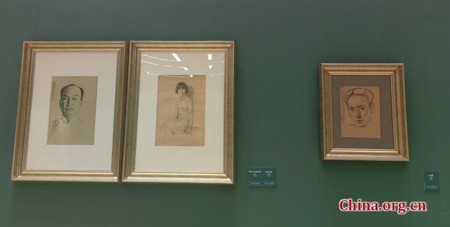 Portraits of painter Xiao Shufang and her father by Jiang Zhaohe, along with a self-portrait by the artist, from 1929, 1937 and 1938, are displayed at an exhibition hosted by the China National Academy of Painting in Beijing, Dec. 29, 2025. Xiao was known for blending watercolor and ink painting techniques. [Photo by Liu Sitong/China.org.cn]