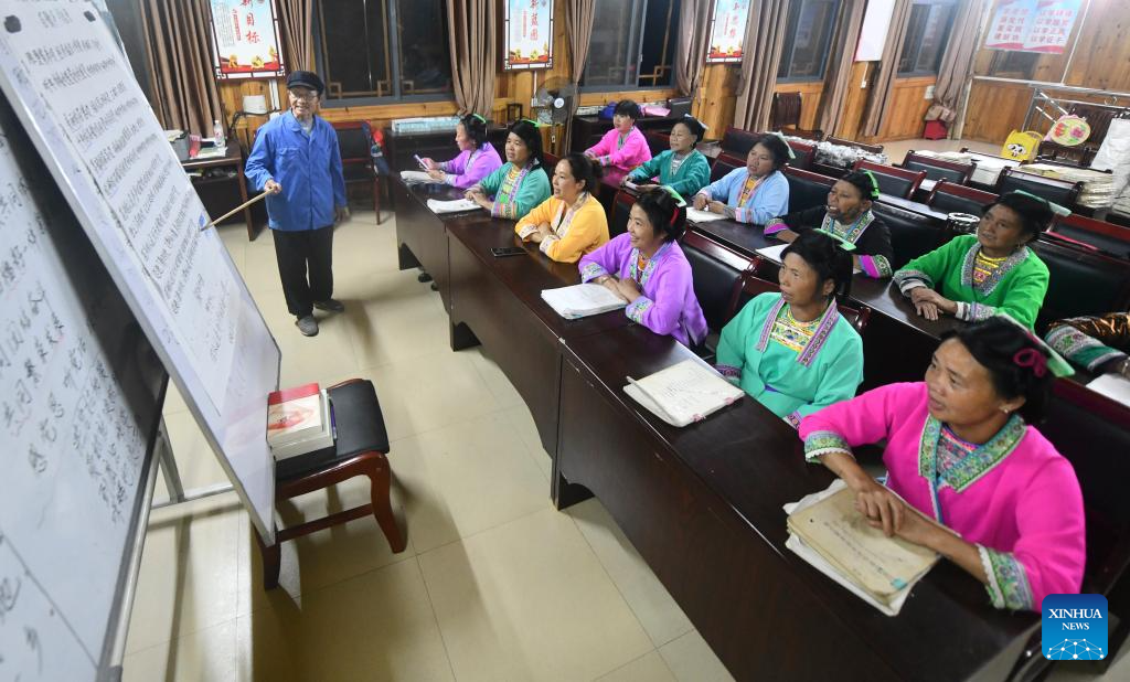 Villagers attend a night class at Wuying Miao village in Rongshui Miao Autonomous County, south China's Guangxi Zhuang Autonomous Region, Sept. 26, 2025. Recent years saw local authorities in Guangxi boosting the development of tourism in the rural areas through a variety of cultural initiatives. (Xinhua/Huang Xiaobang)