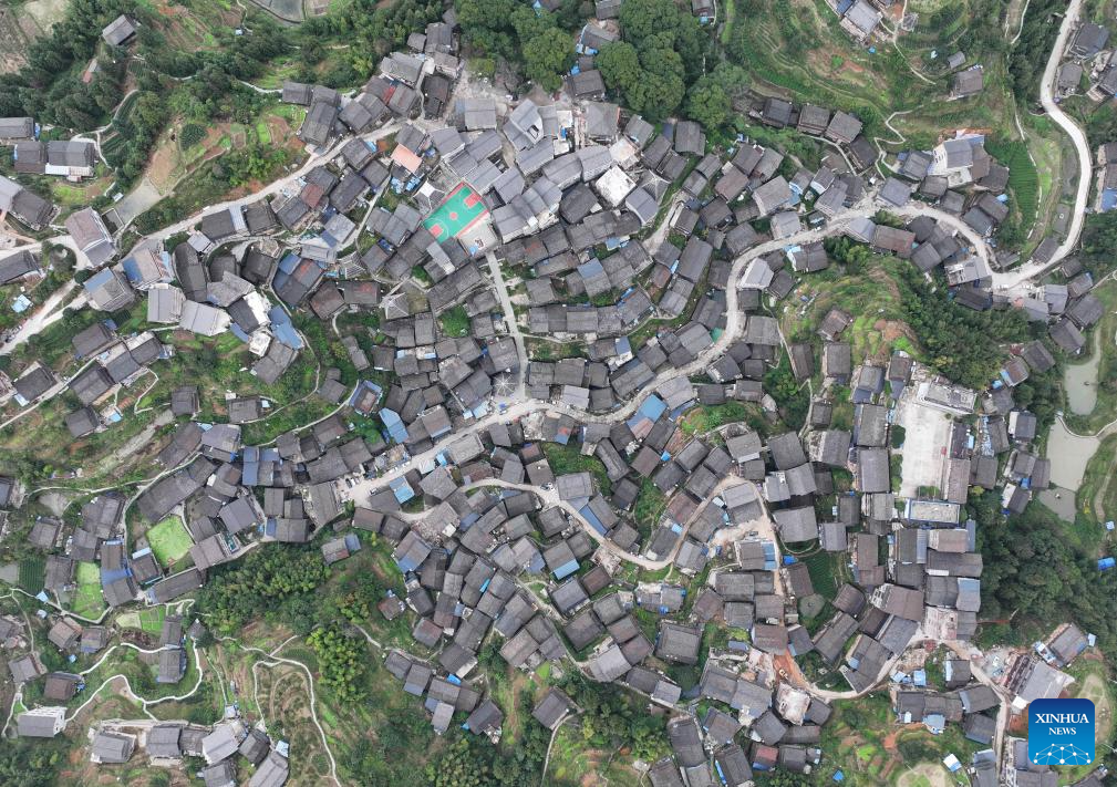 An aerial drone photo taken on Nov. 5, 2025 shows a view of Gaoding Village in Dudong Town of Sanjiang Dong Autonomous County, south China's Guangxi Zhuang Autonomous Region. Recent years saw local authorities in Guangxi boosting the development of tourism in the rural areas through a variety of cultural initiatives. (Xinhua/Huang Xiaobang)