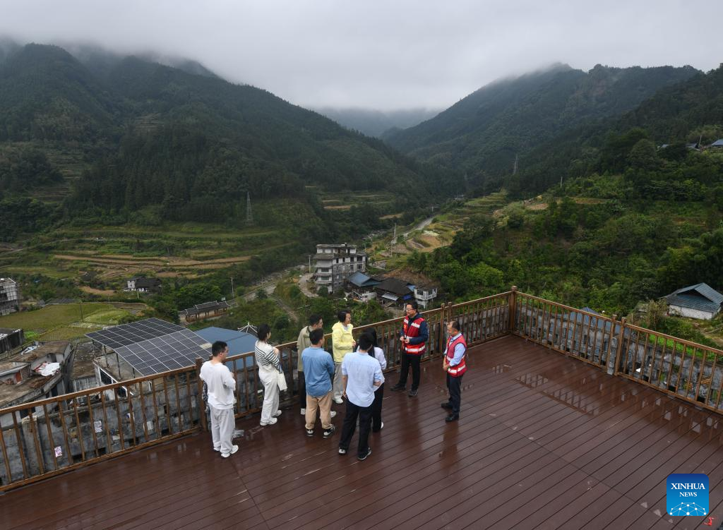 Wang Peng (2nd R), first Party secretary of Zhongping Village, briefs tourists on the village development plan, in Xiangfen Township of Rongshui Miao Autonomous County, south China's Guangxi Zhuang Autonomous Region, Nov. 6, 2025. Recent years saw local authorities in Guangxi boosting the development of tourism in the rural areas through a variety of cultural initiatives. (Xinhua/Huang Xiaobang)